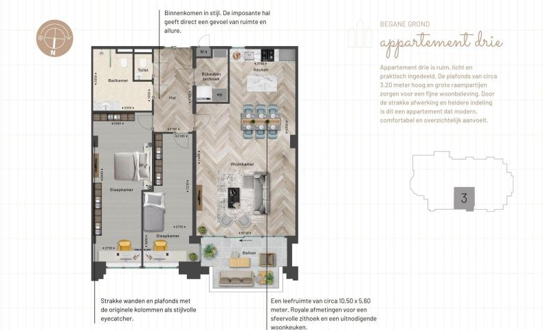 Appartement drie combineert modern wonen met een subtiele knipoog naar de historie van 3EEN. Gelegen op de begane grond en voorzien van hoge plafonds en royale raampartijen, biedt deze woning een comfortabele, overzichtelijke indeling met veel natuurlijke lichtinval. Een stijlvol en praktisch appartement.