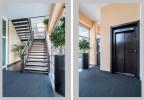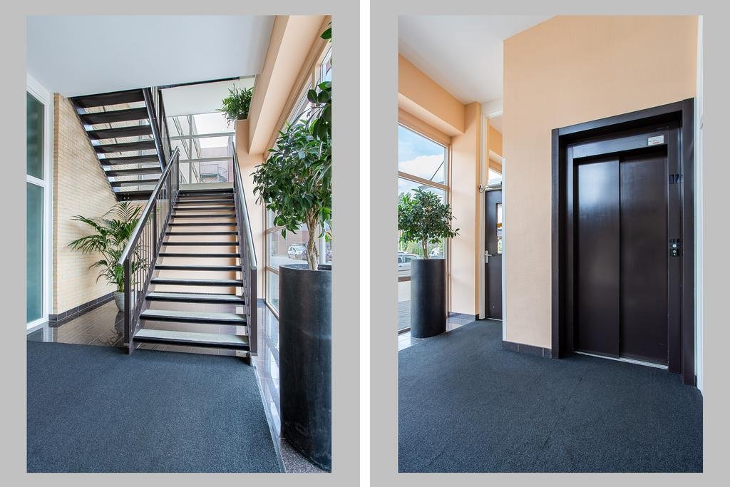 De hoofdentree bevindt zich aan het winkelplein, de postboxen en een videofoon mogen hier natuurlijk niet ontbreken. De centrale hal is ruim en geeft toegang tot het trappenhuis, de bergingen en de parkeergarage. Via de lift komen we op de eerste etage, de hal is licht door veel ramen en de deur tegenover het trappenhuis geeft toegang tot het appartement.
