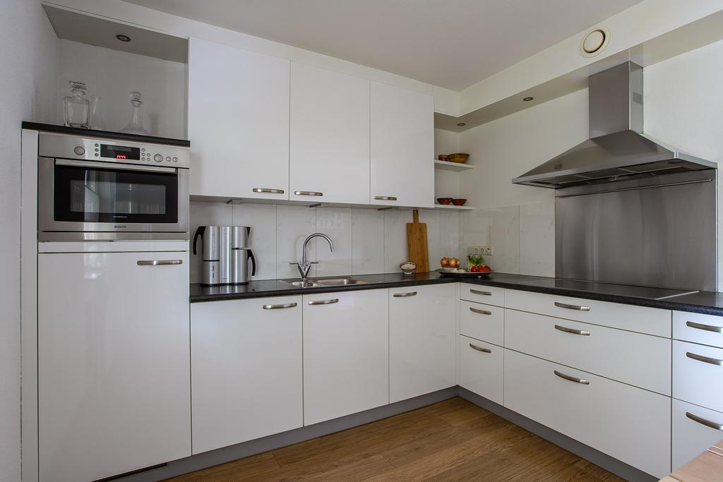 De keuken heeft een raam naar de centrale hal en die grote eettafel is er al voor je geplaatst. De L-vormige keuken is uitgevoerd in hoogglans wit met een brede keramische kookplaat, rvs schouw met afzuigkap, combioven, vaatwasser en een koelkast. Handig! Vanuit de keuken heb je toegang tot de bijkeuken met bergruimte en een wasmachine aansluiting.